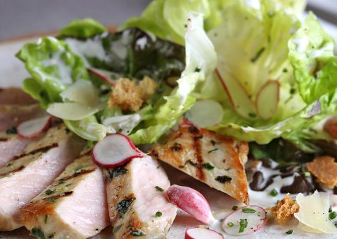 - Place slice pork on a plate, top with the baby gem salad. Garnish with chives and shaved pecorino.