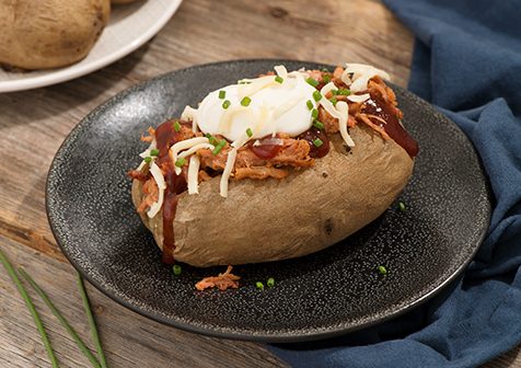 - Fill each potato with 2 oz. pork, 1 oz. each barbecue sauce and sour cream, and 1/2 oz. cheese. Sprinkle with chives before serving.