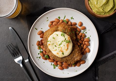 3. Slice the Asadero cheese into normal thick slices and pan sear the cheese on both sides in a non-stick pan. Place the seared Asadero cheese on top of the golden brown medallions and serve with a side of guacamole and pinto beans.