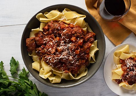 8. Divide pasta on six plates. Add a ladle of ragu on each plate. Garnish with Parmesan cheese.