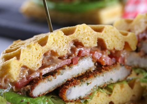 4. Top each waffle with 1 breaded pork chop.