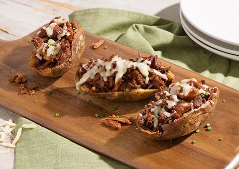 - Spoon pork into potato skin “canoes.” Sprinkle with cheese; broil until cheese is melted.