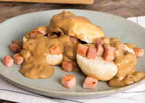 - To serve, ladle 6 oz. gravy over 1 or 2 hot biscuits.