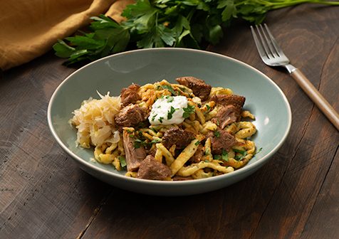 - Portion the spaetzle/pork combination into soup or pasta bowls. Garnish with a scoop of sour cream and a spoonful of sauerkraut.