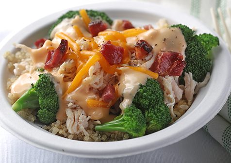 9. Portion each bowl with 1 cup total of the cooked grains, 2 oz pulled chicken, 1 1/2 oz broccoli florets, 3/4 oz chopped bacon.