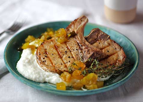 2. To serve: Plate White Cheddar Grits and top with rested pork chop. Garish with Green Tomato Relish.