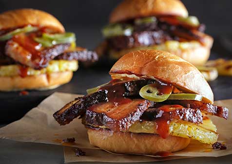 1. Cut smoked pork belly into 4-oz. portions, season with salt and pepper and lightly rub 1 Tbsp. brown sugar on 1 side.
