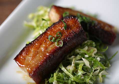 4. Plate a portion of pork belly with a portion of Brussels Sprout Slaw.