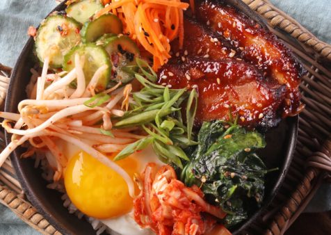 - Cook pork belly. Once cooked, add pork belly and bibimbap vegetables to a bowl. Top the bowl with bibimbap sauce.