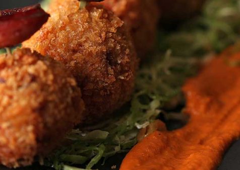 11. Bread croquettes by dipping into flour, egg wash and then breadcrumbs, and coat appropriately.