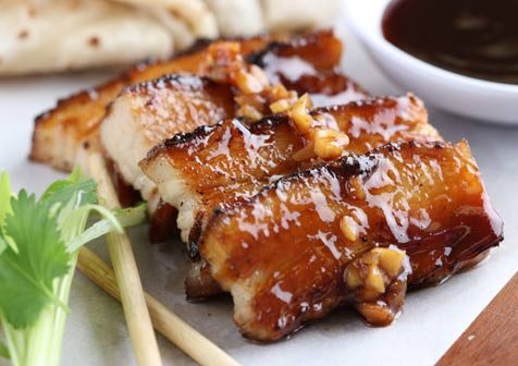 - To serve, place pork belly on bamboo skewers and grill. Glaze the pork belly with soy glaze and place in oven to heat through. Plate family style and serve with garnish.