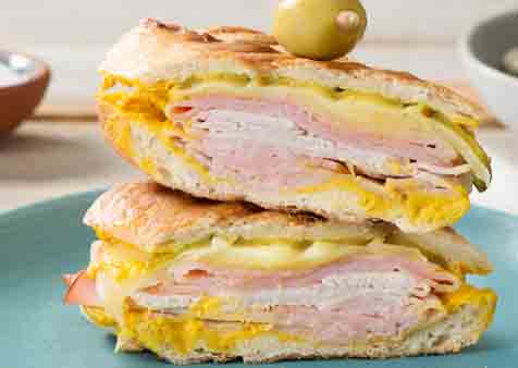 1. Spread mustard onto heel and crown of bread. Place pork loin and ham on heel.