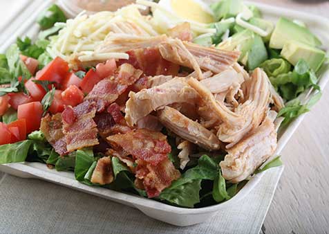 2. Arrange pulled chicken, avocado, corn pico de gallo, and eggs on lettuce.